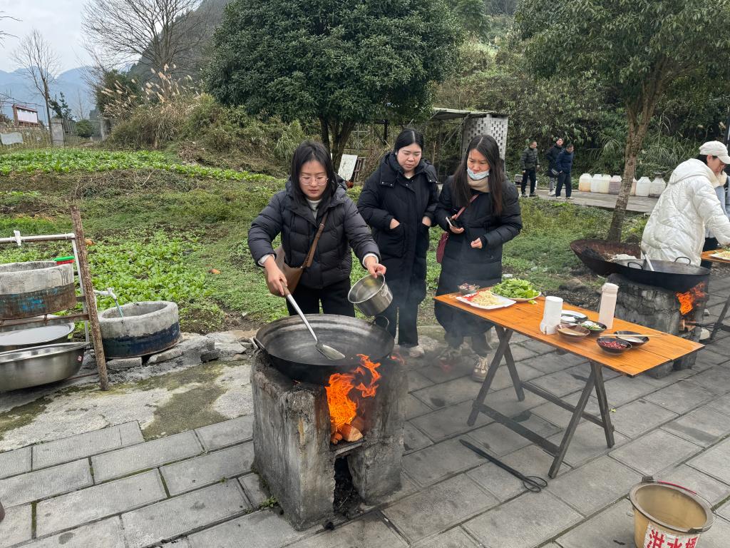 中午研学团在指定地点开展“埋锅造饭”体验式教学。教师们分工协作,拾柴生火、切菜做饭,在自给自足中体验红军长征途中的艰苦生活。一碗简餐,别样滋味,大家在炊烟袅袅中感悟革命先辈不畏艰难、自力更生的坚强意志。一位青年教师感慨道:“这顿饭让我们真切体会到‘一粥一饭当思来之不易’,更深刻理解了红军战士在极端艰苦条件下依然保持革命乐观主义的伟大品格。”